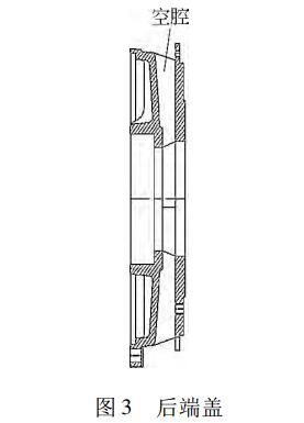 當電機質心變化時,吊環螺釘可以跟著移動,只需用緊定螺釘將吊環安裝板固定在合適的位置,還優化就可以確保吊環螺釘總是在電機的質心處,使電機在吊裝時總是平衡的。冷卻風可以通過通風口流通,不會被電機接線盒阻擋,可以有效降低出線盒處的溫度。U形槽的作用: 電機的端蓋與機座通過雙頭螺桿固定,U形槽4個均布,可以固定雙頭螺桿的位置,同時又起到散熱片的作用,既不增加機座的質量又可以增加機座的散熱面積。帶繞組定子鐵芯采取熱套工藝,同時通過緊定螺釘孔固定,保證電機能夠頻繁正反轉。定子采取外止口加工工藝,主要可以保證定子的氣隙同軸度。通過試驗驗證,增加了機殼散熱面積后電機的溫升下降了23 K,電機的振動及噪聲都非常小。由于電動葫蘆的工況決定了電機可能頻繁制動,因此,設計了一種特殊的后端蓋,如圖3所示,將制動器摩擦面和軸承隔開,可以避免頻繁摩擦導致熱量直接傳遞到軸承將軸承燒毀。