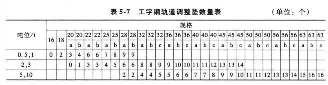2、根據(jù)選用工字鋼型號規(guī)格的不同,調(diào)整電動小車的墊圈數(shù)量,要保證兩側輪緣與工字鋼間要有3-5mm的間隙。工字鋼軌道調(diào)整墊數(shù)量見表5-7.