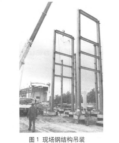 吊車選擇:現場鋼結構吊裝時,成片鋼結構常采用一機主吊、一機抬吊法進行吊裝,立柱常采用單機旋轉法進行吊裝。由于成片鋼結構整體重量重于10t,高度在20m以上,吊點一般設置在頂部橫梁處,雙吊點吊裝。所以根據情況考慮負載、地面脫鉤,在吊裝過程中選用大噸位、長臂吊車。且吊索高度應與立柱或者鋼結構高度一致,吊車吊裝高度至少為鋼結構高度的一倍。