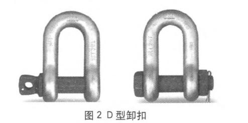 如圖2、3所示,在起重吊裝索具中,卸扣屬于連接件。一般起重用的D型和弓型卸扣均由鍛造制成。卸扣由扣體、銷軸等易拆卸的零件裝配成的組合件,由圖2、3可知,左側卸扣的銷軸為w型帶孔和抬肩的螺紋銷軸,右側卸扣的銷軸為X型六角頭螺栓型銷軸,并配有六角螺母和開口銷。兩種形式的卸扣安裝時,均需先將銷軸穿人卸扣本體左側環眼至另一端,W型直接擰入卸扣本體緊定,X型需將螺母旋緊緊定或插開口銷緊定。卸扣裝卸時,均需作業人員雙手操作,且均需要一定的緊定或拆卸時間。