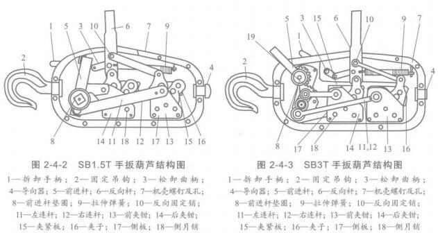 常用的手扳葫蘆有SB1.5T、SB3T兩種型號。其外形如圖2-4-1所示。SB1.5T手扳葫蘆的結構如圖2-4-2所示。SB3T手扳葫蘆的結構如圖2-4-3所示。