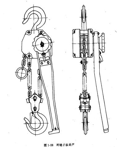 環(huán)鏈手扳葫蘆的結構如圖1-28所示,它采用一級齒輪轉動,主要有齒輪軸、齒輪、制動器、起重鏈條、鏈輪、吊鉤、操作手柄等。