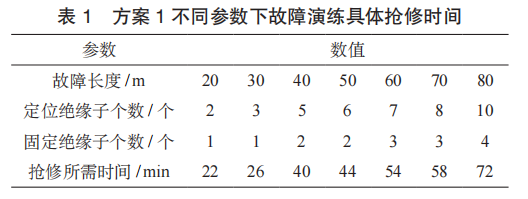 根據接觸網塌網故障長度的不同,以及定位和固定絕緣子個數的不同,方案1故障演練具體搶修時間見表1,處理完畢后經判斷具備送電條件后即可送電,列車限速通過。