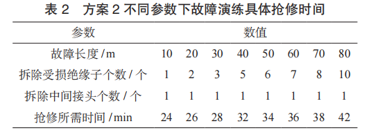 根據接觸網受損長度的不同,處理的時長也不同,方案2故障演練具體搶修時間見表2,將該段接觸網拆除后經判斷具備送電條件后電調送電,車輛在通過該區域時,必須降弓通過,否則會造成二次故障。
