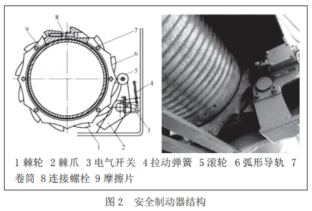 超速保護(hù)裝置中提到了安全制動(dòng)器,其結(jié)構(gòu)型式見(jiàn)圖2。標(biāo)準(zhǔn)規(guī)定當(dāng)起重機(jī)額定起重量大于5t時(shí),電動(dòng)葫蘆除設(shè)置一個(gè)工作制動(dòng)器外,還應(yīng)設(shè)置安全制動(dòng)器,且設(shè)置在電動(dòng)葫蘆的低速級(jí)上(當(dāng)起重機(jī)額定起重量小于或等于5t時(shí),也宜在低速級(jí)上設(shè)置安全制動(dòng)器,否則電動(dòng)葫蘆應(yīng)按1.5倍額定起重量設(shè)計(jì)),并要求在正常作業(yè)時(shí),安全制動(dòng)器應(yīng)在高速軸制動(dòng)器閉合后延時(shí)閉合,其延時(shí)動(dòng)作時(shí)間可調(diào),進(jìn)行緊急制動(dòng)時(shí),安全制動(dòng)器應(yīng)立即動(dòng)作。