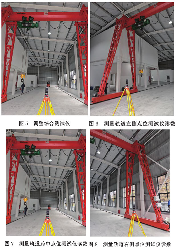 司,該設(shè)備于2023年5月19日校準(zhǔn),設(shè)備正常。面對(duì)主梁,放置綜合測(cè)試儀,調(diào)整水平(圖5)。將電動(dòng)葫蘆運(yùn)行至左側(cè)接近支腿處,露出軌道端部便于后續(xù)測(cè)量。