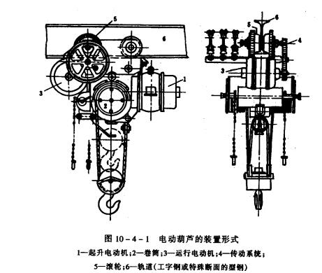 圖10-4-1所示,兩臺電動機各自驅動其起升機構,或運行機構的鋼絲繩式的電動葫蘆其起升機構由電動機、卷筒及其相應的傳動系統所構成,運行機構則包括電動機,并通過傳動系統與驅動輪相連,電動葫蘆通常沿工字鋼下翼緣的踏面移動,當然,在有些場合下,還可沿具有特殊斷面的軌道運行。